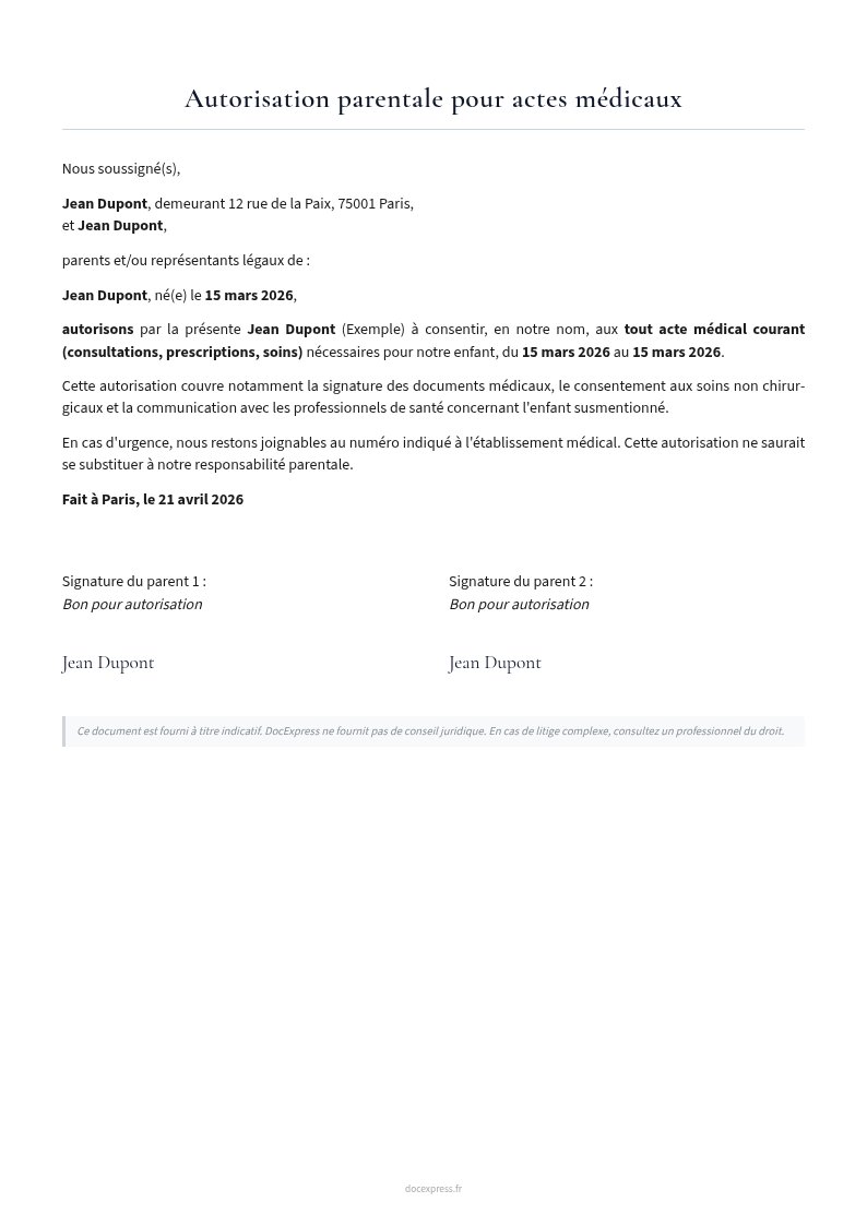 Autorisation parentale pour actes médicaux