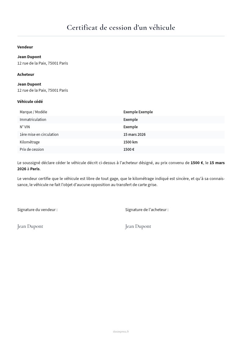 Document officiel de vente de voiture entre particuliers (équivalent CERFA 15776*01) à remettre à l'acheteur et à la préfecture.