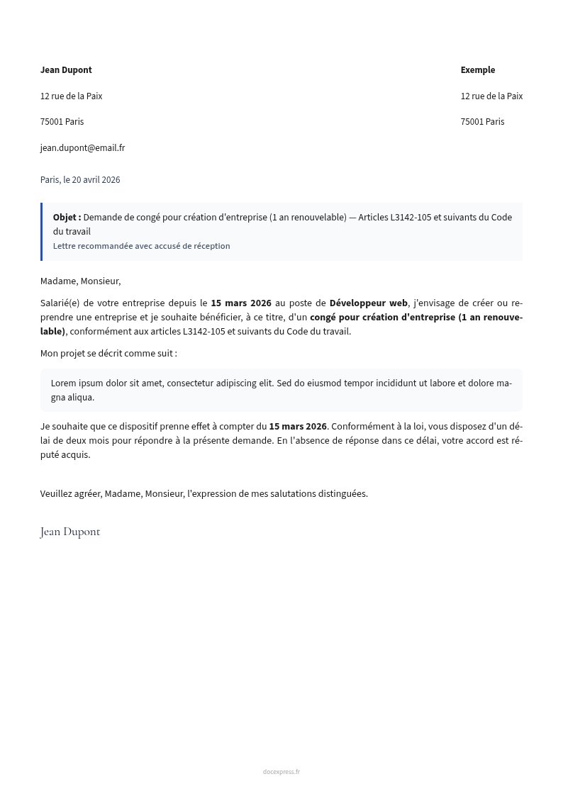 Lettre de demande de congé ou de passage à temps partiel pour créer ou reprendre une entreprise (droit légal après 24 mois).