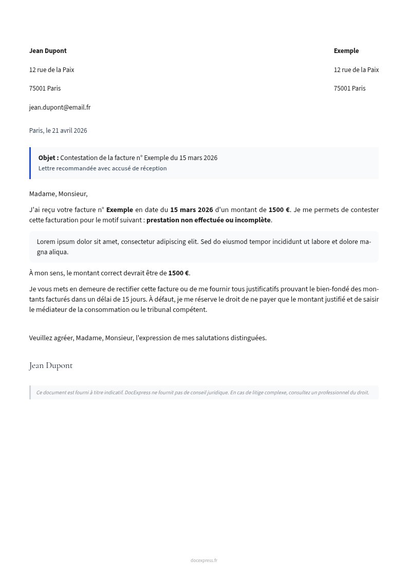 Lettre de contestation d'une facture incorrecte, abusive ou non conforme, avec mise en demeure de rectification.