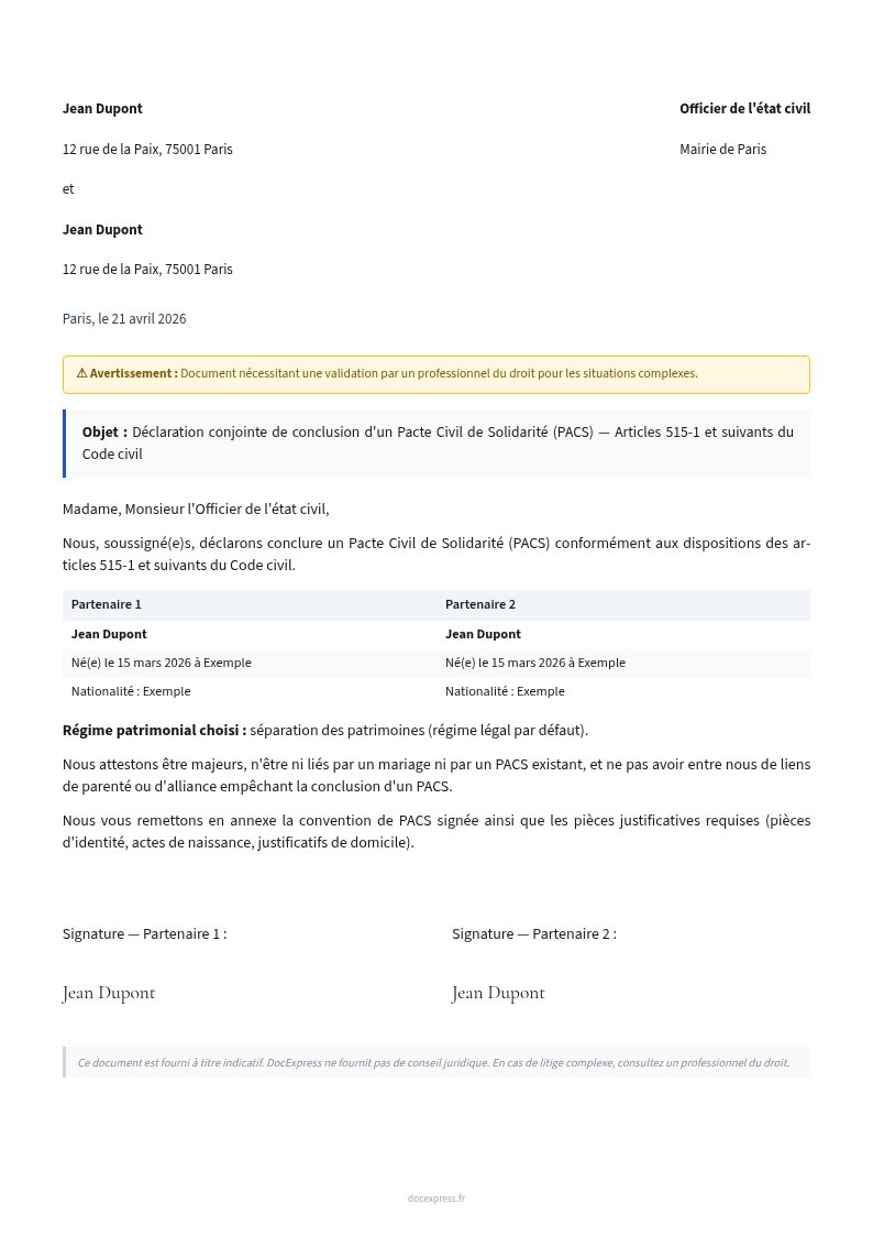 Lettre de demande d'enregistrement d'un PACS auprès de l'officier d'état civil, conformément aux articles 515-1 et suivants du Code civil.