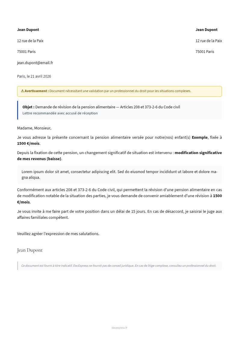 Lettre de demande de révision d'une pension alimentaire auprès du tribunal ou de l'autre parent, conformément aux articles 208 et 373-2-6 du Code civil.