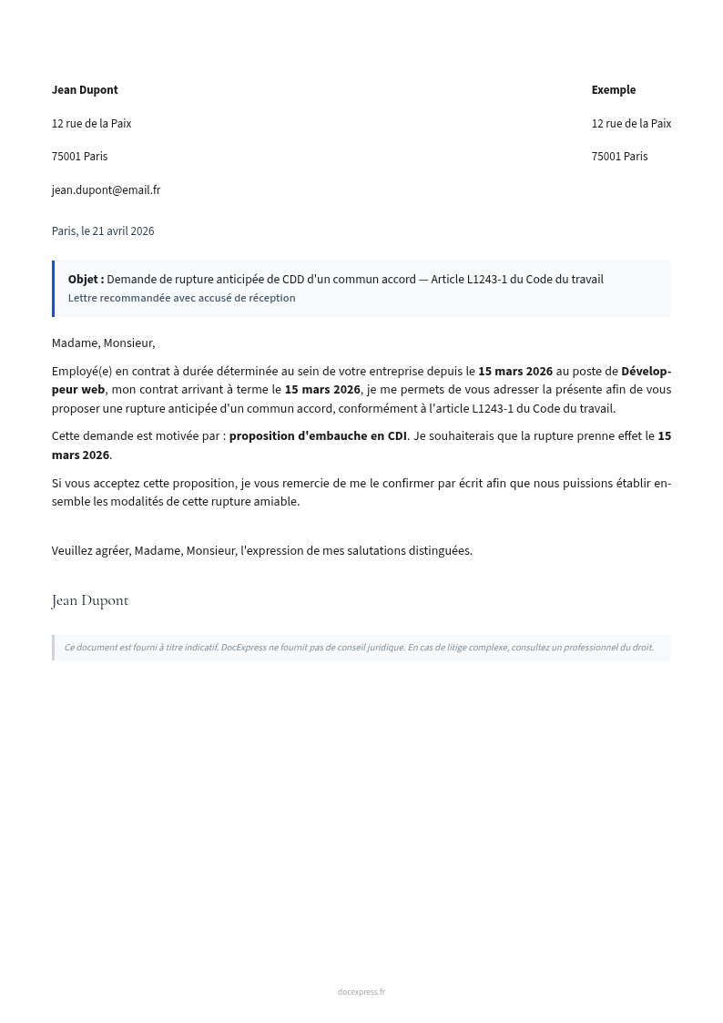 Lettre de demande de rupture anticipée d'un CDD d'un commun accord, conformément à l'article L1243-1 du Code du travail.