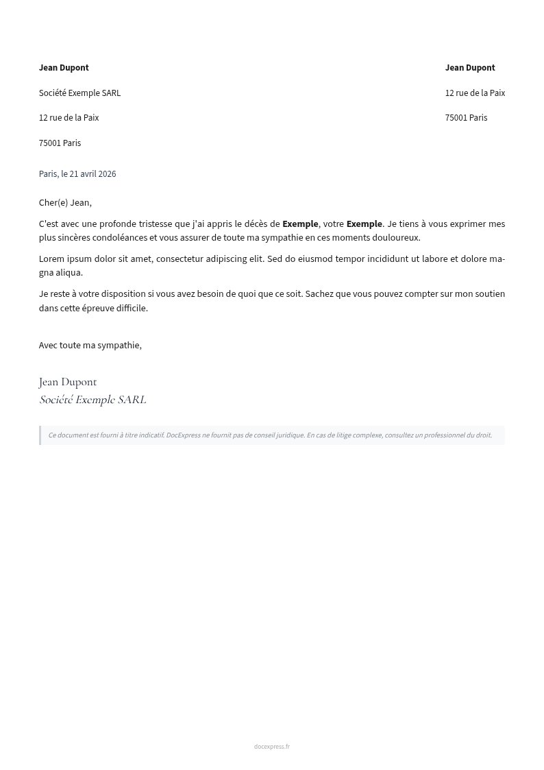 Lettre de condoléances à adresser à un collègue, un partenaire ou un client ayant subi un deuil, dans un cadre professionnel.