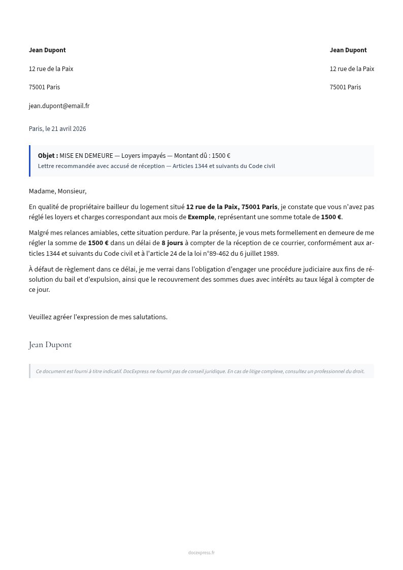 Mise en demeure loyer impayé (propriétaire)