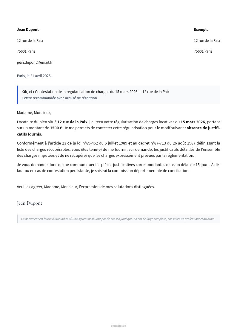 Lettre de contestation d'une régularisation de charges locatives, avec demande de justificatifs, conformément à l'article 23 de la loi du 6 juillet 1989.