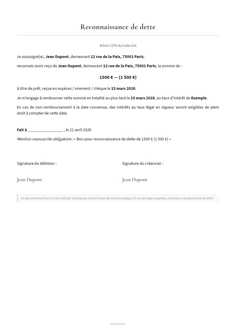 Document de reconnaissance de dette entre particuliers ou professionnels, avec montant en chiffres ET en lettres, conformément à l'article 1376 du Code civil.