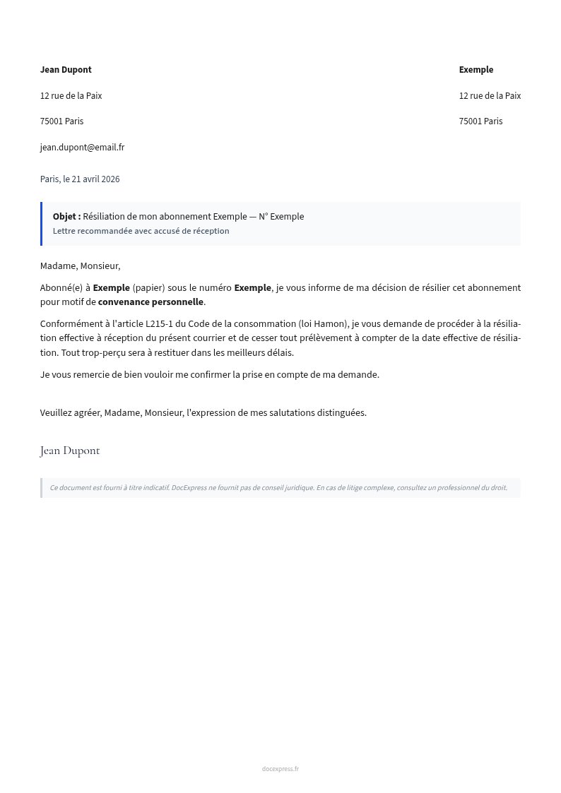 Résiliez votre abonnement à un magazine ou journal papier ou numérique, conformément à la loi Hamon et à l'article L215-1 du Code de la consommation.