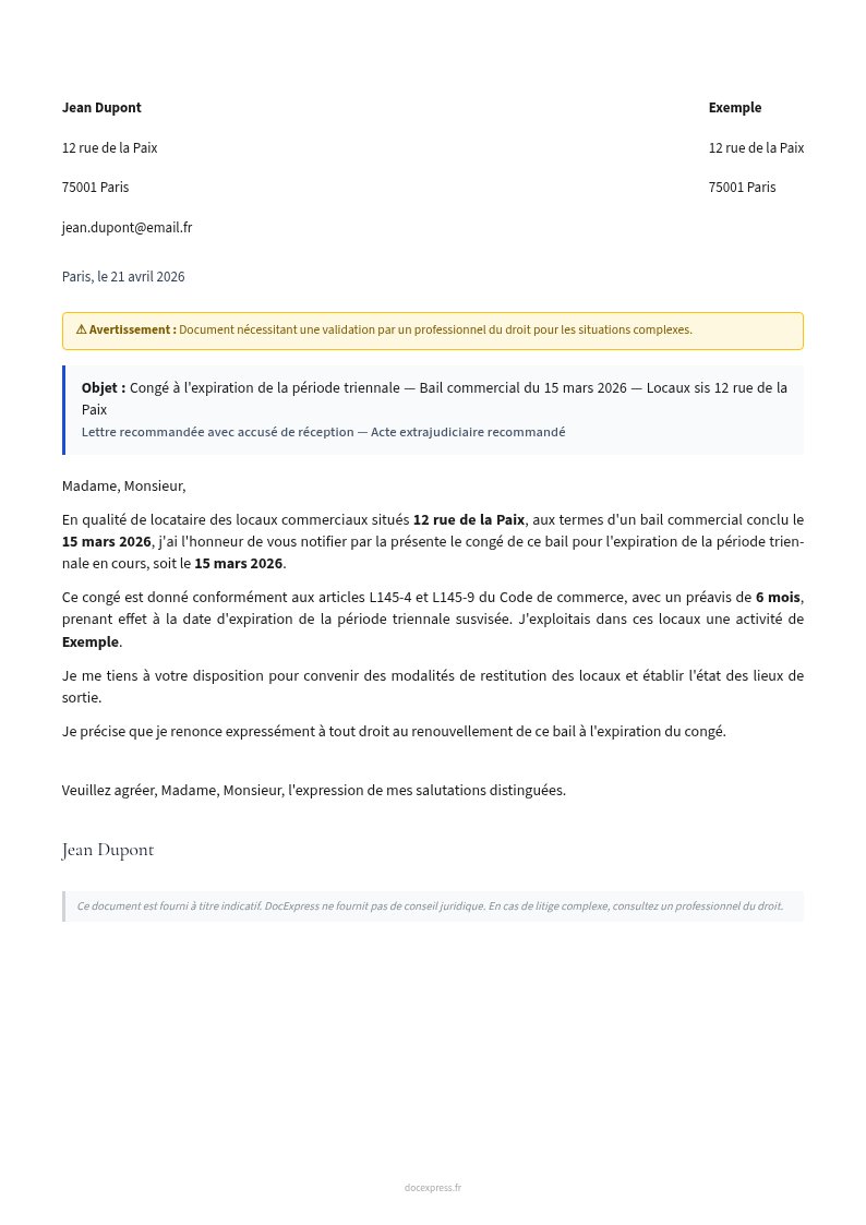 Lettre de résiliation d'un bail commercial à l'expiration d'une période triennale, conformément aux articles L145-4 et L145-9 du Code de commerce.