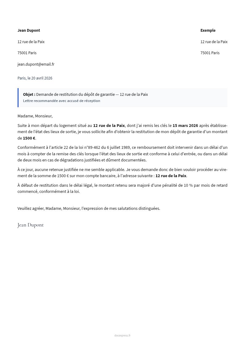 Lettre de demande de restitution du dépôt de garantie après votre départ du logement.