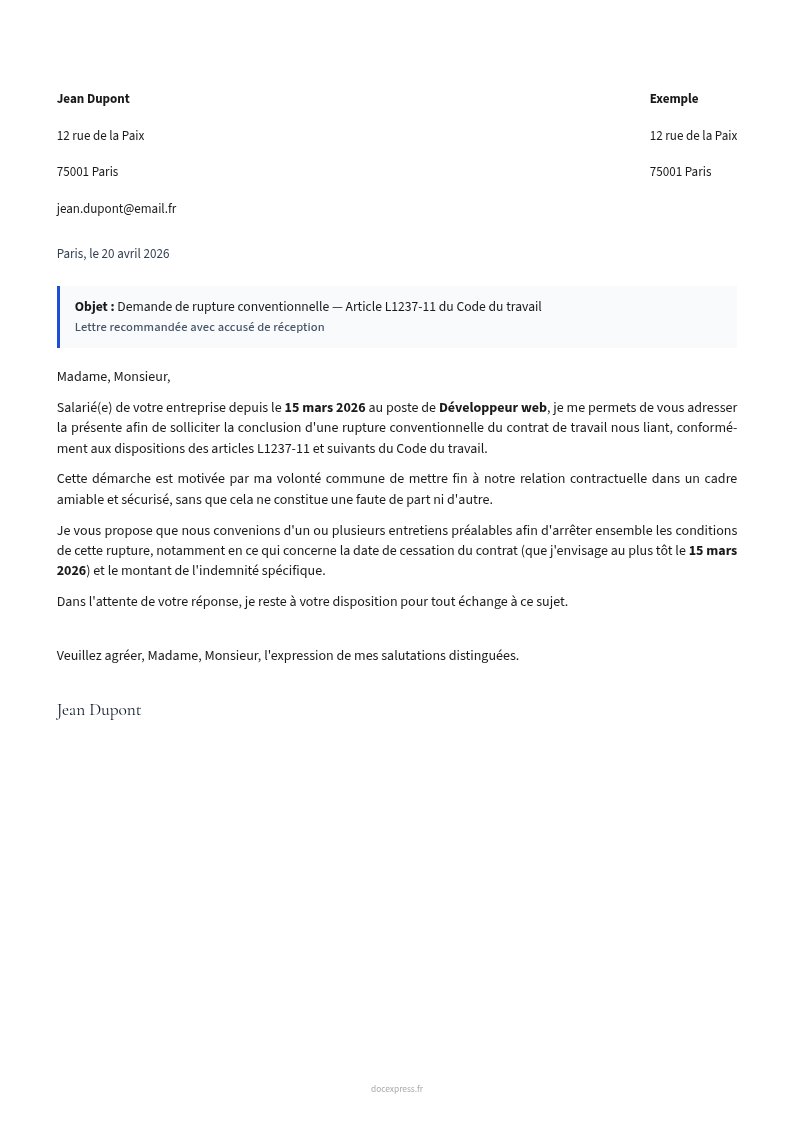 Lettre de demande de rupture conventionnelle à l'employeur (formulaire Cerfa + négociation indemnités).