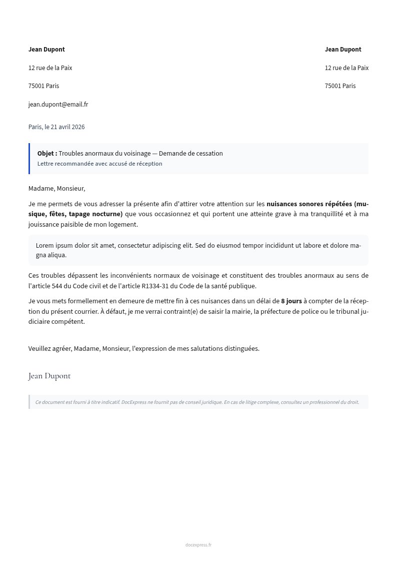 Lettre troubles du voisinage